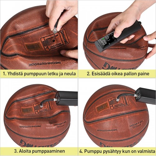 Pumppaa pallot tästä lähtien vaivattomasti - anna pumpun hoitaa kaikki työt! Pienikokoinen ja hiljainen pumppu täyttää yhdellä latauksella 35-45 palloa. Pumppu ladataan USB-johdon avulla. Tarvittava paine esisäädettävissä helppolukuisen ja selkeän LED-näytön avulla. Kestävä metallirunko Pakkaus sisältää pumpun lisäksi USB-Micro USB-latausjohdon, joustavan pumppuletkun, neulaventtiilin ja muovipään uimarengasta varten. Pumpussa integroitu LED-taskulamppuominaisuus. Sisältää säilytyspussin pumppua ja tarvikkeita varten. Maksimipaine: 12 PSI Ulosvirtaava ilmavirta: 4,0 litraa minuutissa Pumpun koko: 160*40*40 mm Paino: 260 g.